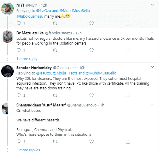 It was revealed that doctors who care for Coronavirus patients will get a hazard fee of 50,000 Naira per day. Nurses, lab scientists and pharmacists will get a hazard fee of 30,000 Naira per day, and ward heads, cleaners and drivers who handle Coronavirus patients will get a hazard fee of 20,000 Naira per day.