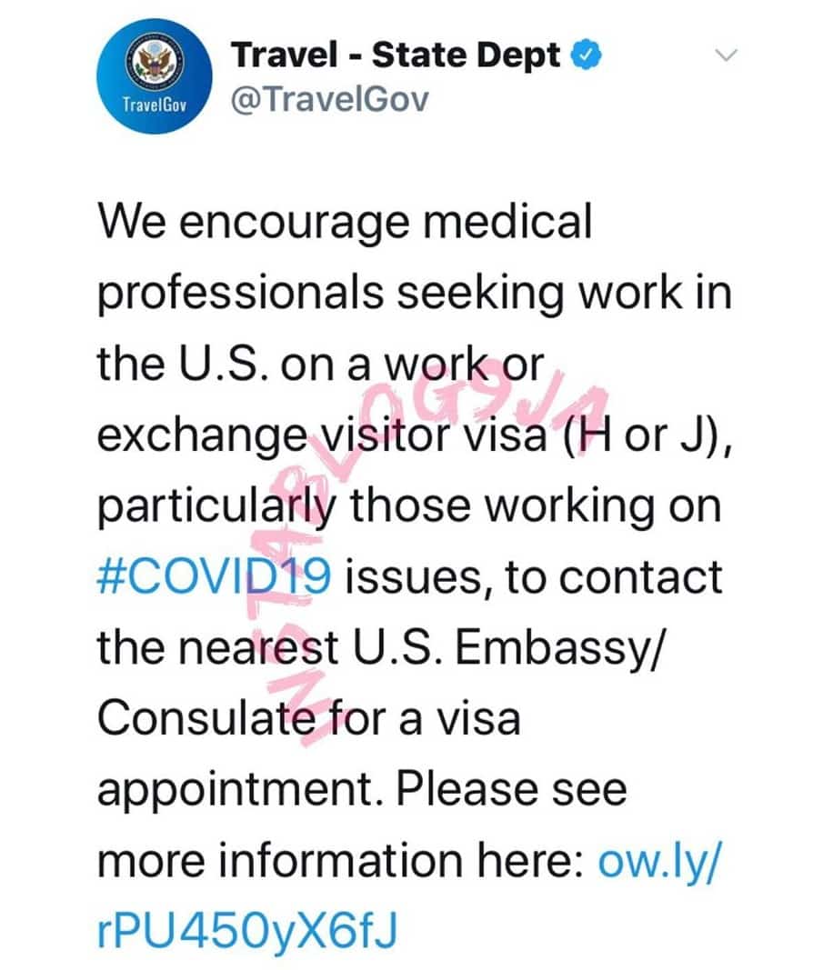 “We encourage medical professionals seeking work in the U.S. on a work or exchange visitor visa (H or J), particularly those working on #COVID19 issues, to contact the nearest U.S. Embassy/ Consulate for a visa appointment,” said a statement by the Bureau of Consular Affairs.