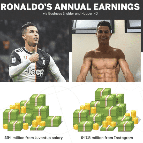 “Ronaldo is the most followed human on Instagram (with 186 million followers) so companies are paying almost $1 million for posts to access his insane reach.