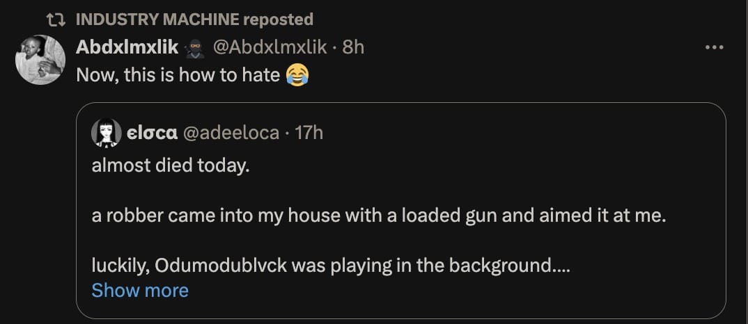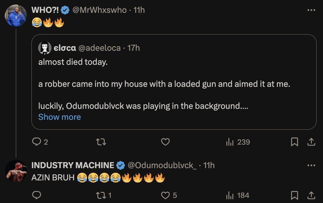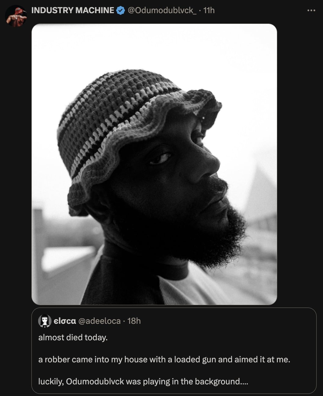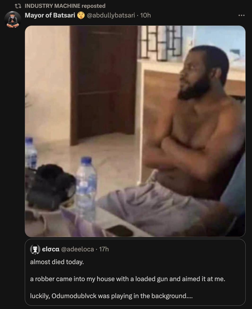 “Almost died today. A robber came into my house with a loaded gun and aimed it at me. Luckily, Odumodublvck was playing in the background. He ran out of my house before his ears started bleeding and spared my life. Thank god.”