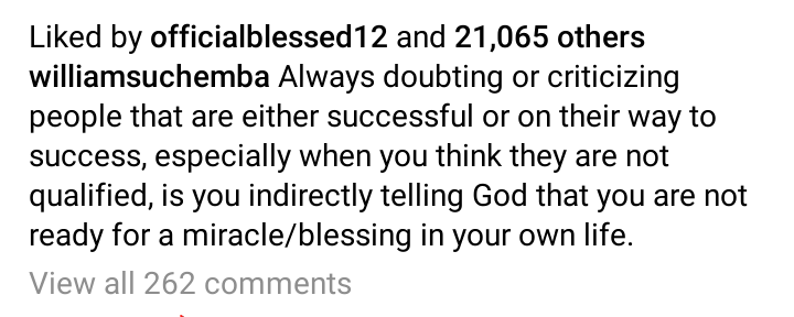 “Always doubting or criticizing people that are either successful or on their way to succy, especially when you think they are not qualified, is you indirectly telling God that you are not ready for a miracle/blessing in your own life.”