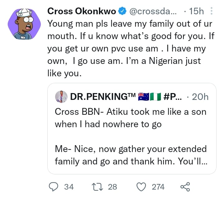 Enraged by this, Cross has warned the Twitter user to keep his family out of his mouth and that he has the right to choose whomever he wants.