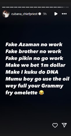 Socialite, Cubana Chief Priest has challenged Burna Boy to a $1 million face-off after the singer’s generous offer to his alleged baby mama and son.