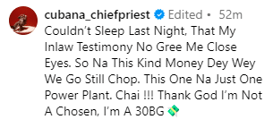 “Couldn’t Sleep Last Night, That My Inlaw Testimony No Gree Me Close Eyes. So Na This Kind Money Dey Wey We Go Still Chop. This One Na Just One Power Plant. Chai !!! Thank God I’m Not A Chosen, I’m A 30BG💸”