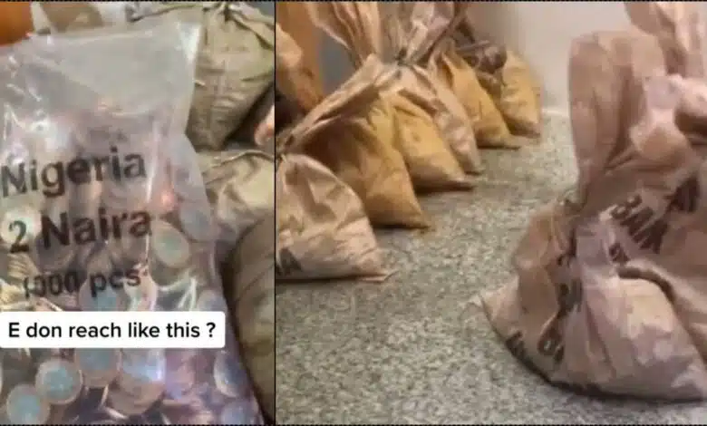 A video making the rounds on social media captured the moment a bank handed out coins to customers. A bag of labelled 1000 pieces of N2 coins is seen in the video as the customer lamented.