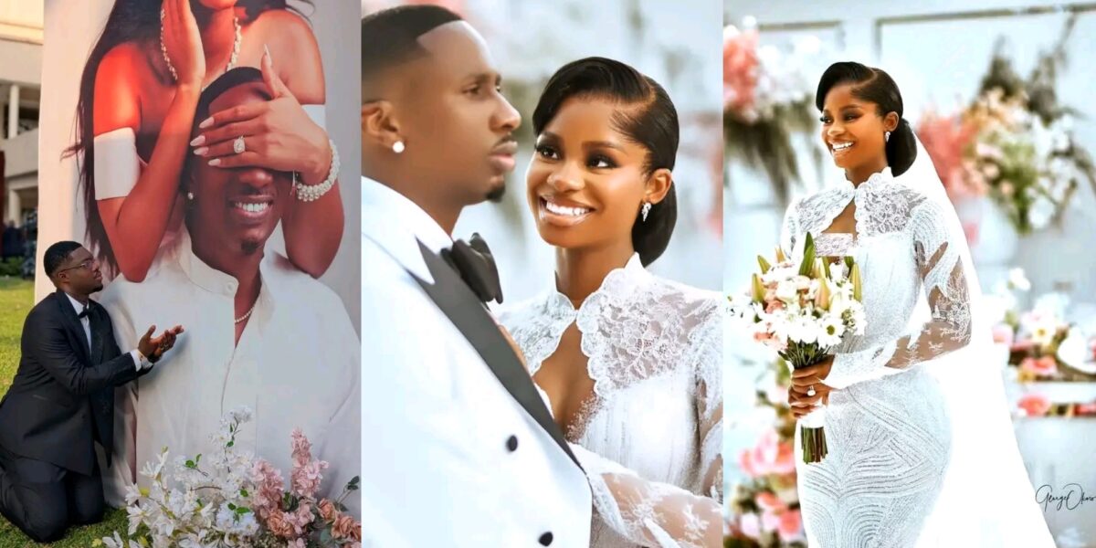 The video features Cute Abiola, dressed in a suit, kneeling as he appeals to Juma Jux, with a portait of the newlywed visible.