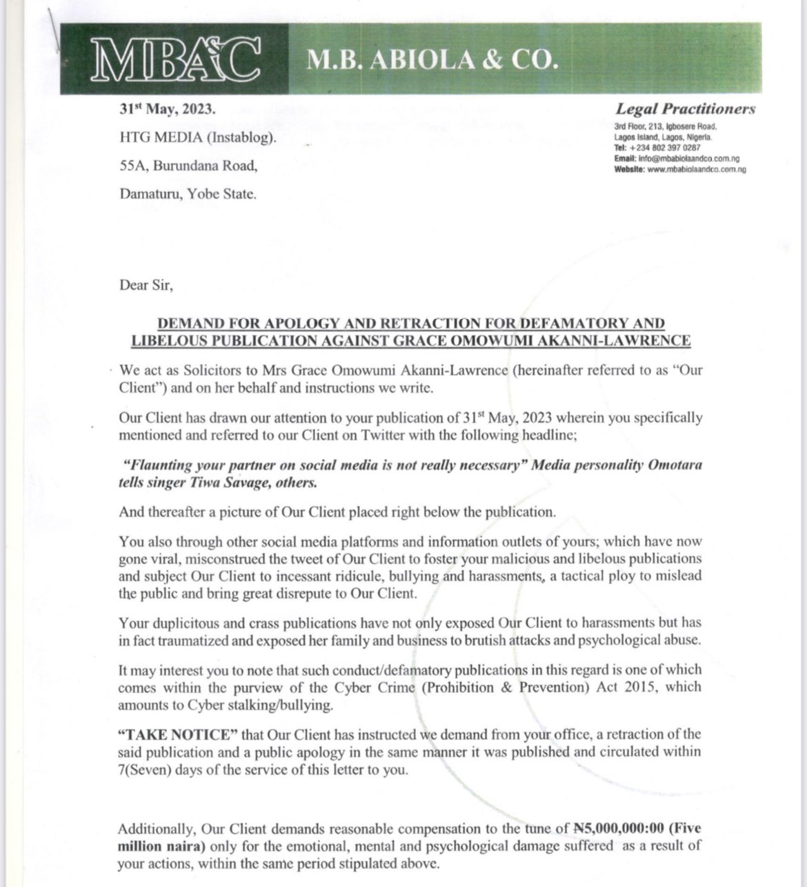 “You also through other social media platforms and information outlets of yours; which have now gone viral, misconstrued the tweet of Our Client to foster your malicious and libelous publications and subject Our Client to incessant ridicule, bullying and harassments, a tactical ploy to mislead the public and bring great disrepute to Our Client.