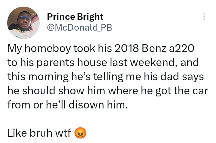 “My homeboy took his 2018 Benz a220 to his parents house last weekend, and this morning he’s telling me his dad says he should show him where he got the car from or he’ll disown him.