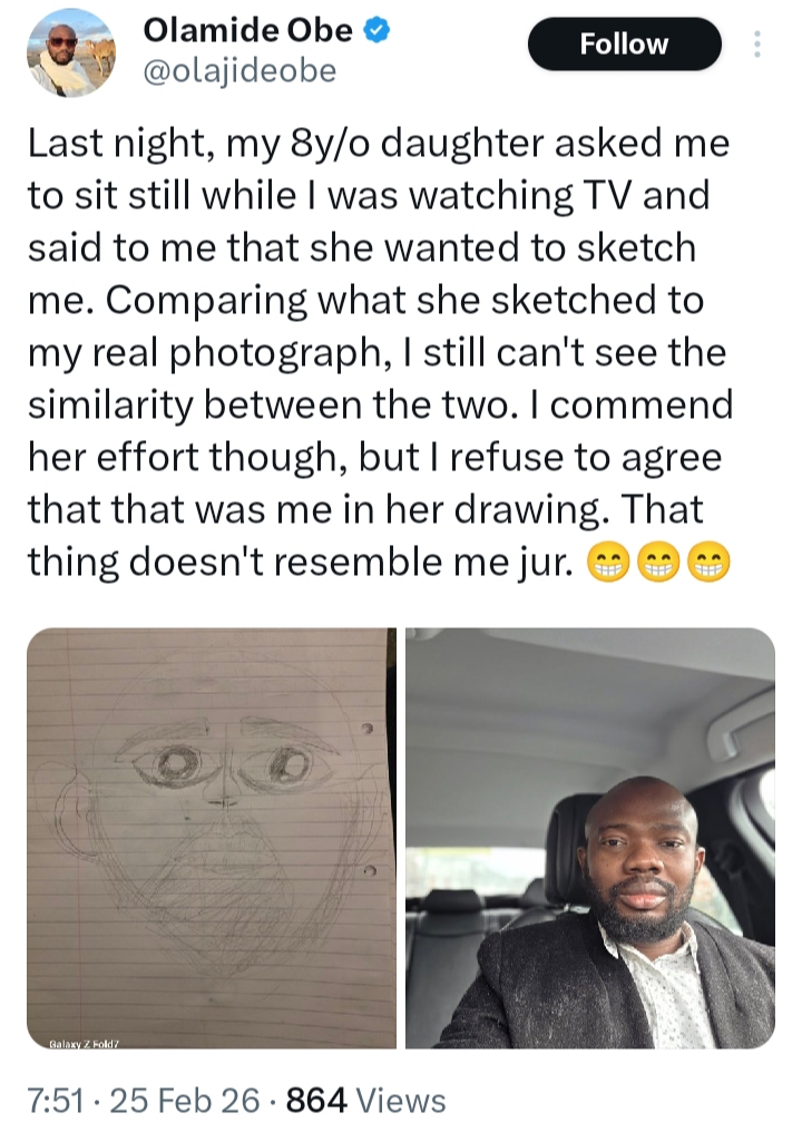 The post, shared by @olajideobe on X, included a photo of the drawing his young daughter made at home after asking him to sit still so she could create a portrait. He agreed, jokingly warning her to make sure it turned out well.