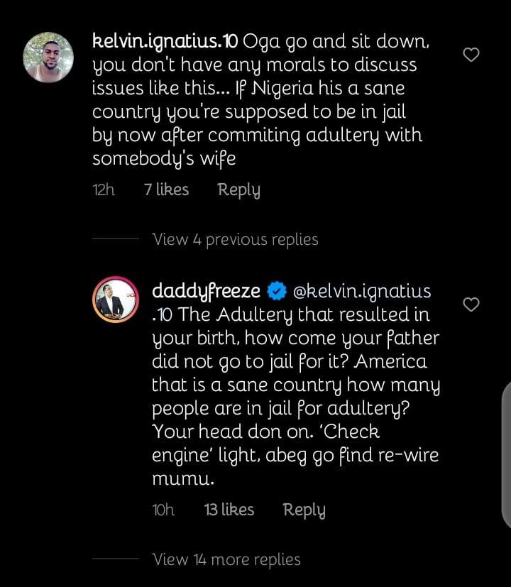 Daddy Freeze replies; ‘‘The adultery that resulted in your birth, how come your father did not go to jail for it. America is a sane country; how many people are in jail for adultery? Your head don on. Check engine light, abeg go and find rewire mumu’
