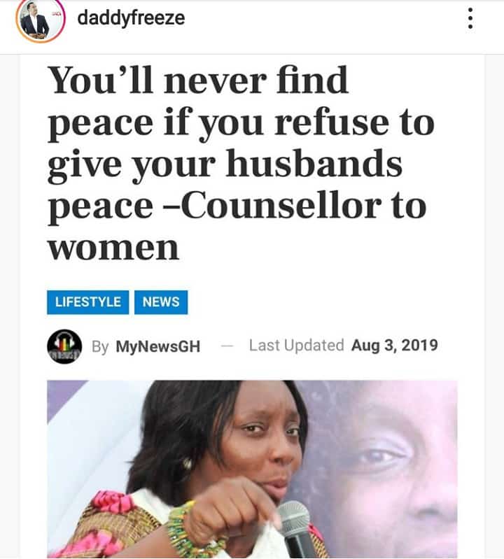 Daddy Freeze has reacted to a statement made by a Ghanaian counsellor that women will not have peace if they refuse to give their husbands peace.