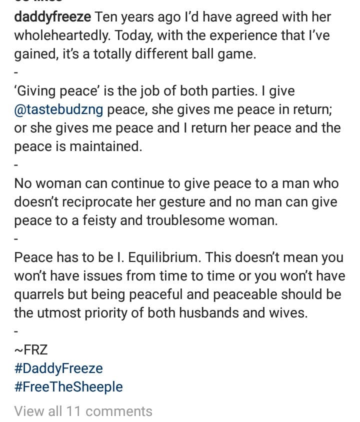 Daddy Freeze disagrees with counsellor who told women they’ll never find peace if they refuse to give their husbands peace
