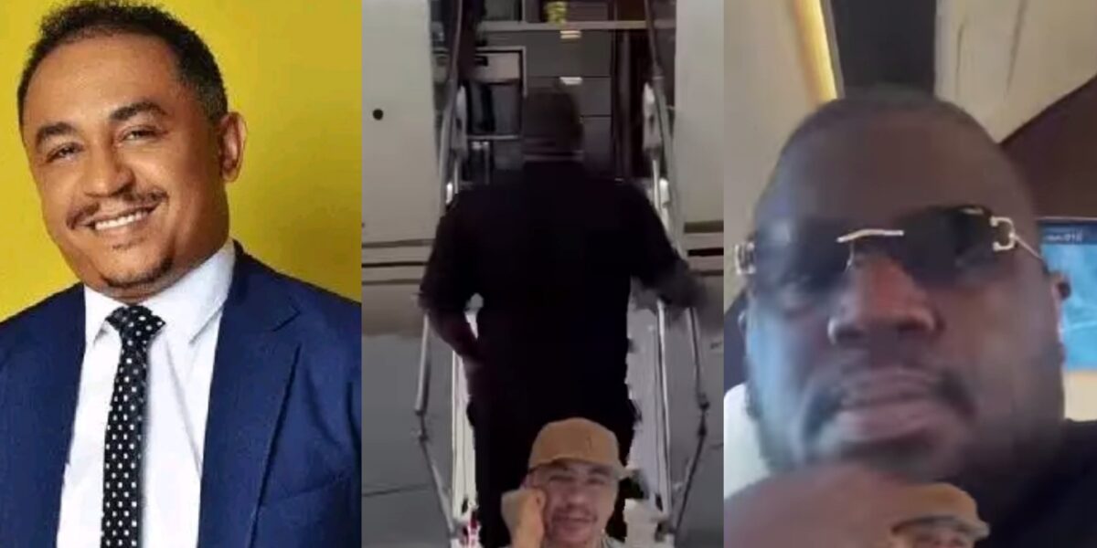 Radio personality, Daddy Freeze reacts as music executive, Soso Soberekon boards a luxury private jet in the United States.