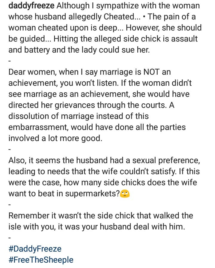 He wrote: Although I sympathize with the woman whose husband allegedly Cheated…The pain of a woman cheated upon is deep… However, she should be guided… Hitting the alleged side chick is assault and battery and the lady could sue her.