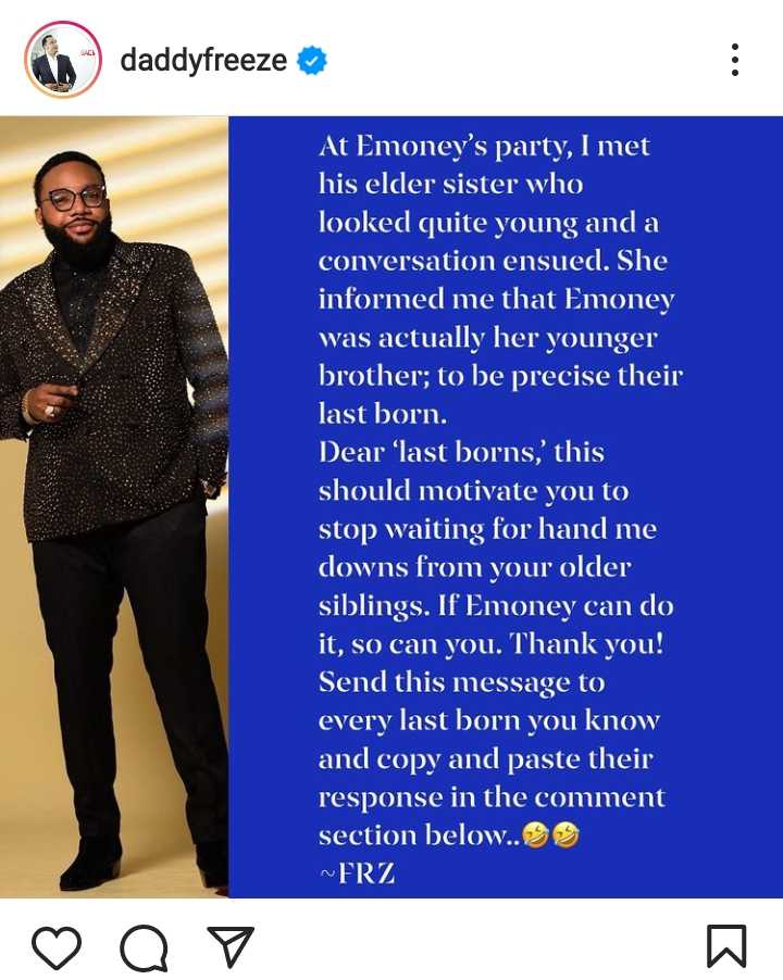 Popular On-air-personality, Daddy freeze has taken to his social media page to send an important public message to all last borns.