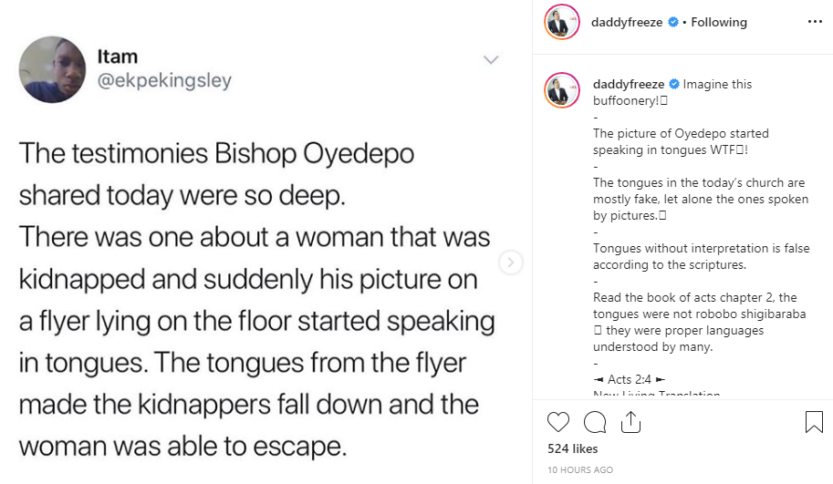 Daddy Freeze who also reacted, stated that some tongues spoken in modern churches are mostly fake let alone the ones spoken by pictures. He added that tongues without interpretation is false according to the scriptures.