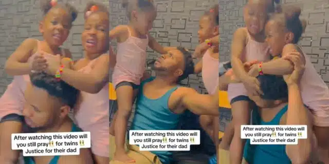 “Daddy sef don give up” – Moment twin girls battle over who will plait their daddy’s hair