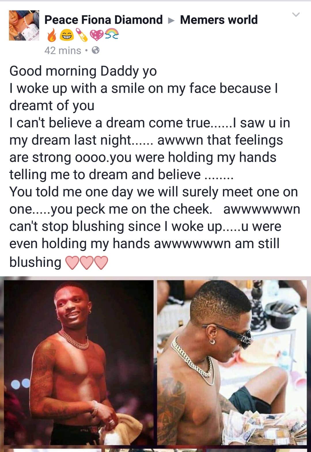 A Nigerian lady identified as Peace Fiona Diamond has taken to facebook to profess her undying love for ace singer, Wizkid.