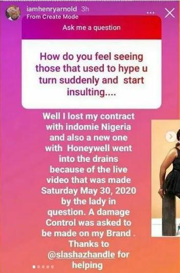 “Well i lost my contract with indomie Nigerian and also a new one with Honeywell went into the drains because of the live video that was made Saturday May 30th 2020 by the lady in question. A damage control was asked to be made by my brand. Thanks to @slashazhanle for helping.”