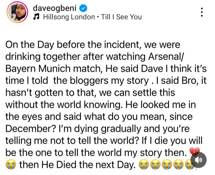 “On the Day before the boat incident, Jnr Pope and I were drinking together after watching Arsenal/ Bayern Munich match, He said Dave I think it’s time I told the bloggers my story. I said Bro, it hasn’t gotten to that, we can settle this without the world knowing. He looked me in the eyes and said what do you mean, since December? I’m dying gradually and you’re telling me not to tell the world? If I d!e you will be the one to tell the world my story then and He D!ed the next Day. When it is time, I will speak for the world to hear”.