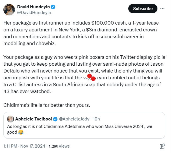 Famed journalist, David Hundeyin heavily berates a critic for expressing joy that the beauty queen, Chidimma Adetshina failed to clinch first position at the 2024 Miss Universe.