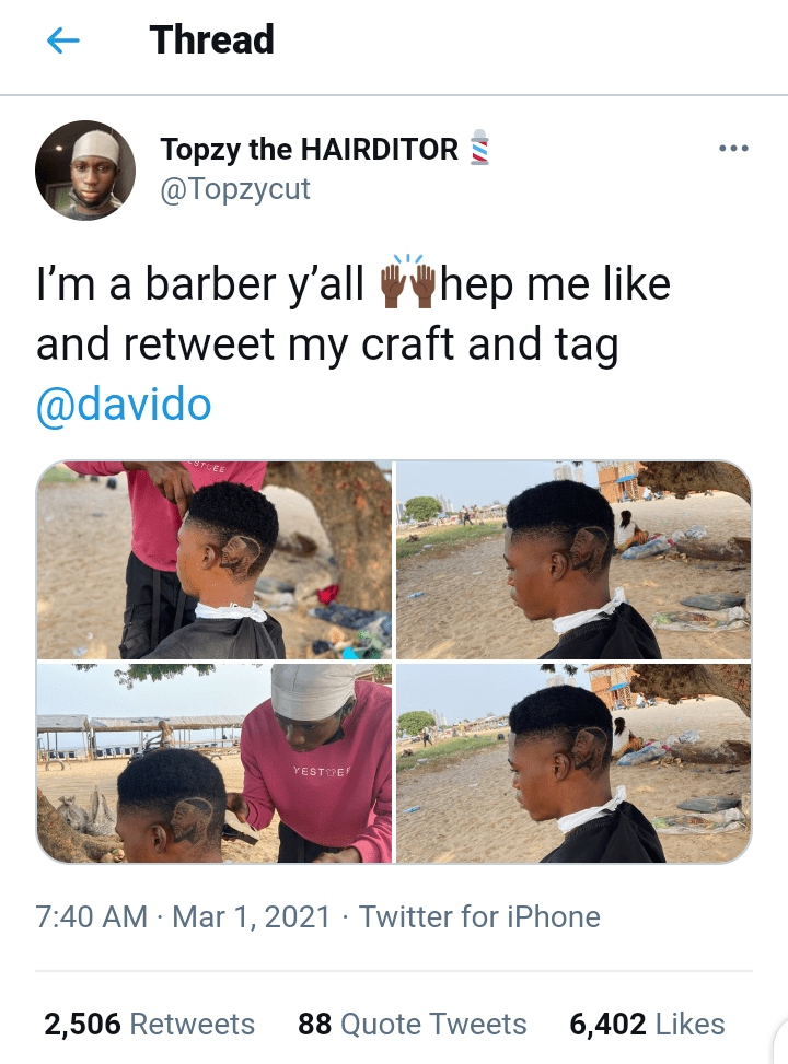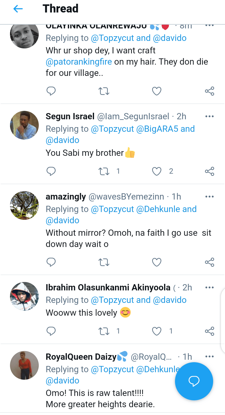 As the drive for every Nigerian youth in finding his/her talent continues, this young popular barber with his Twitter handle @topzycut is not left out with his creative drive.