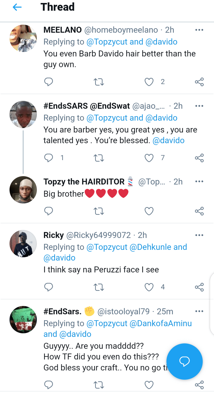 As the tattoo saga as a way of showing fan love has died down, another fan has shown his love to Davido by being extremely creative. The young barber has carved the face of Davido on a clean haircut.