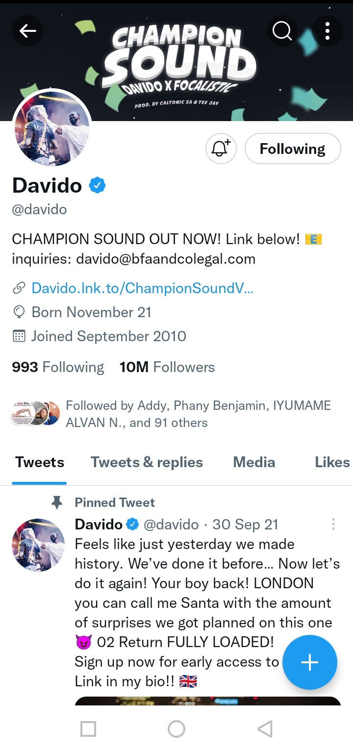 Davido has left fans surprised as be becomes first African singer to reach 10 million Twitter followers. Davido only follows 993 people on Twitter.