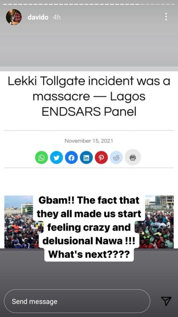 Davido who was among the list of notable celebrities who joined youths to protest against the rigid and abusive nature of the Special Anti-Robbery Squad (SARS) last year 2020, took to his Instagram story to drop a remark after the list of victims were officially rolled out.