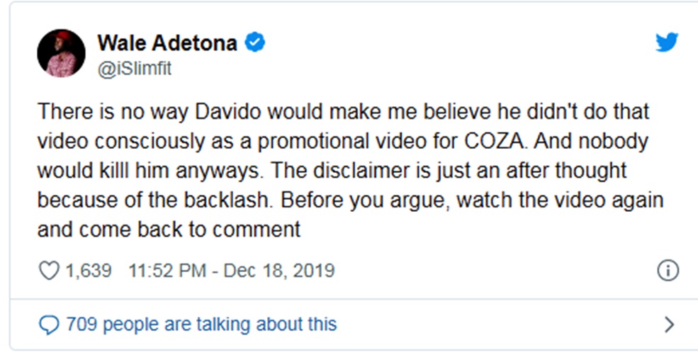 However, Wale Adetona thinks that Davido consciously did the promotional video for COZA and his disclaimer afterwards was because of the backlash he received from some Nigerians.