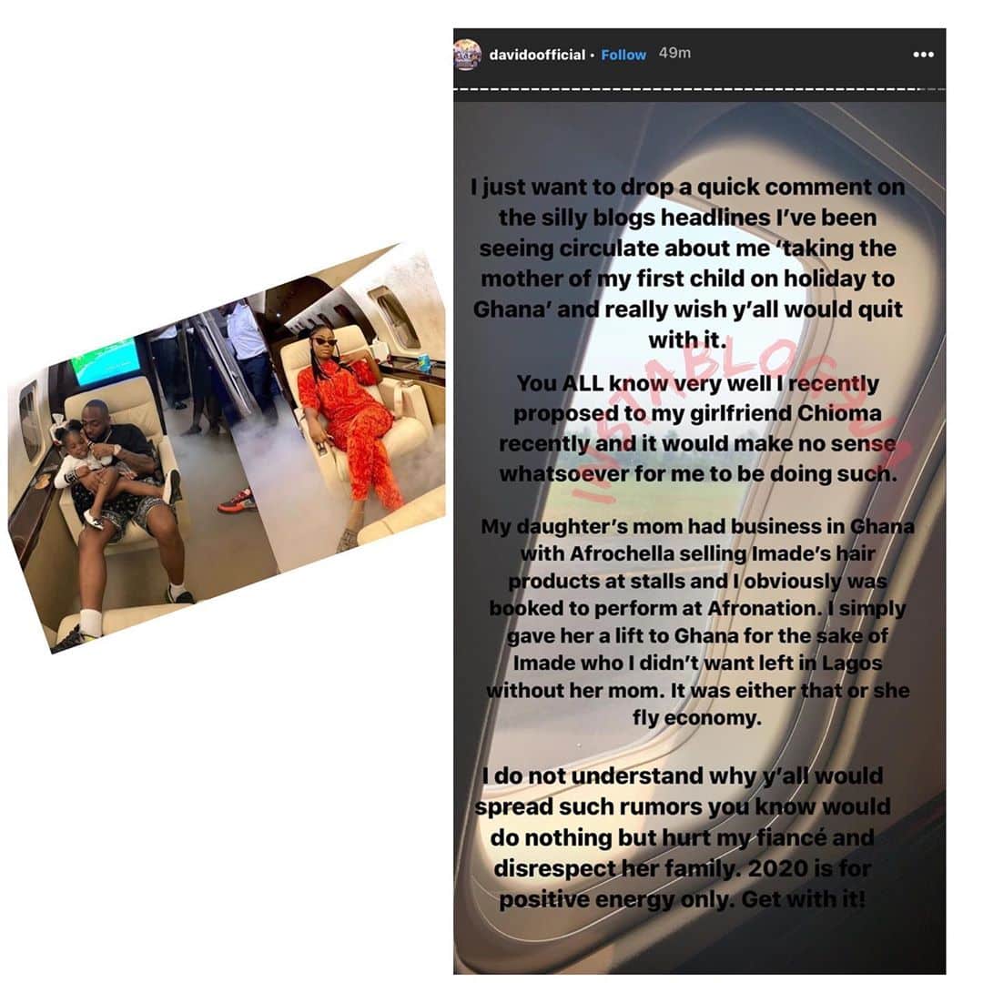Nigerian singer Davido has now taken to his Instagram account to deny the report that he took his first baby mama, Sophia Momodu on a vacation to Ghana.