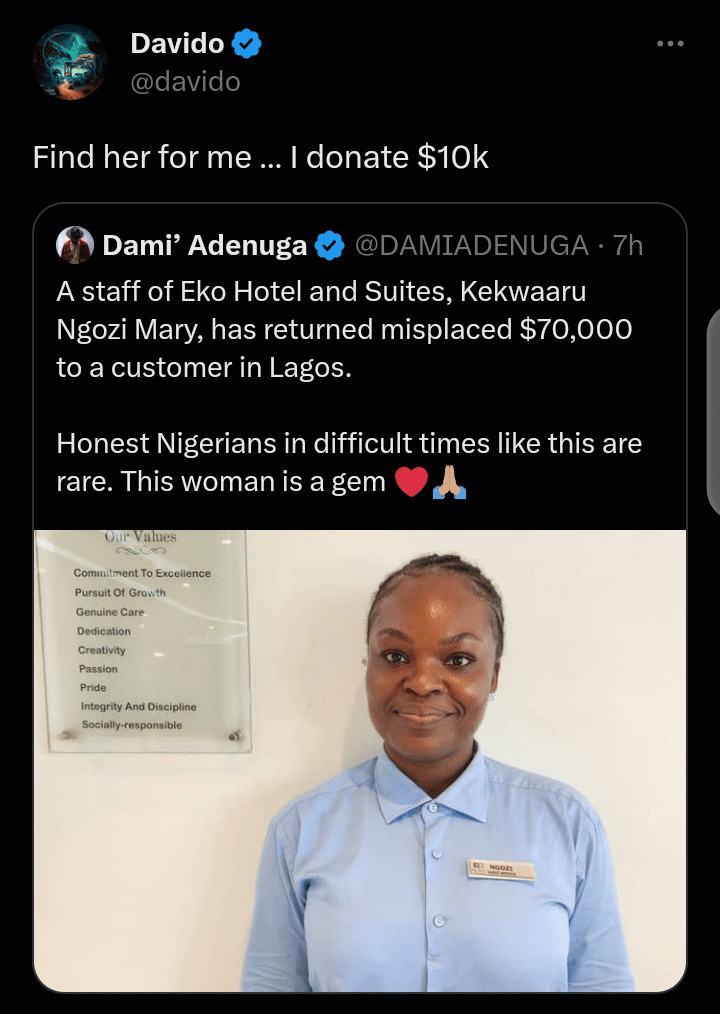 Nigerian singer Davido has decided to reward the honesty and integrity of a dedicated staff member at Eko Hotel and Suites, Kekwaaru Ngozi Mary, with the sum of $10k after she returned $70,000 to hotel management.