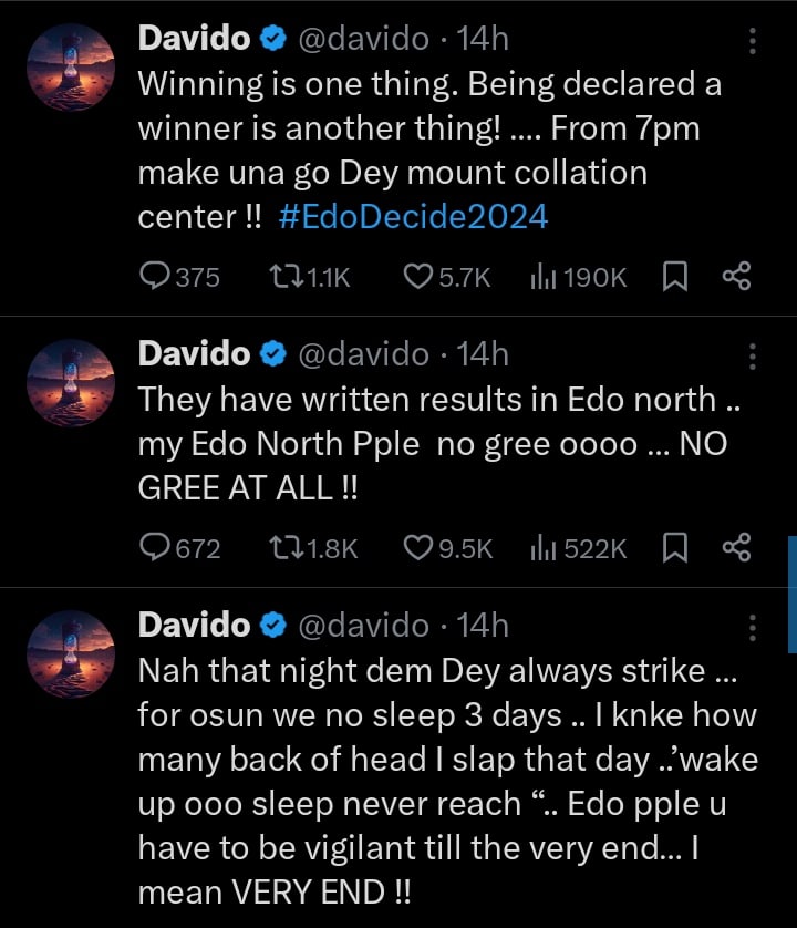 “Winning is one thing. Being declared a winner is another thing! …. From 7pm make una go Dey mount collation center !! #EdoDecide2024,” Davido wrote.