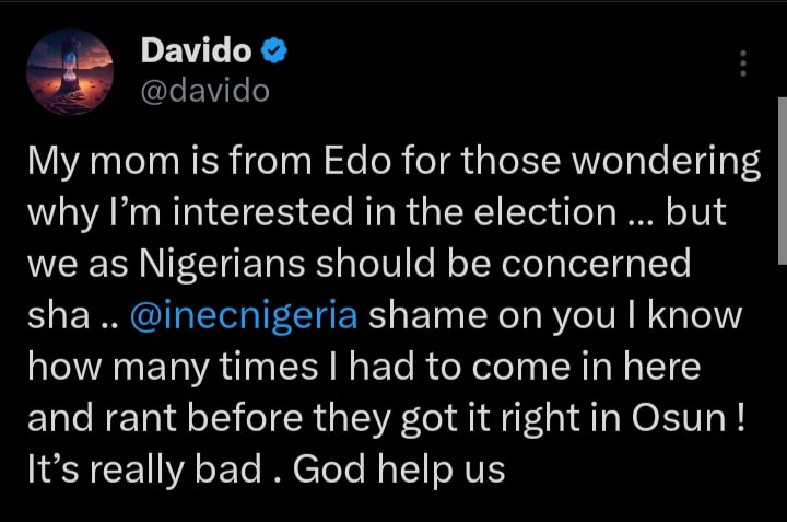 “My mom is from Edo for those wondering why I’m interested in the election … but we as Nigerians should be concerned sha .. @inecnigeria shame on you I know how many times I had to come in here and rant before they got it right in Osun ! It’s really bad . God help us”