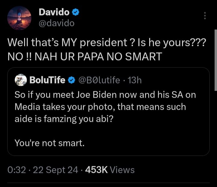 “Well that’s MY president ? Is he yours??? NO !! NAH UR PAPA NO SMART,” Davido wrote.