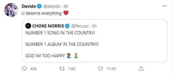In reaction, Davido lauded the singer of truly worth the milestone as he wrote in reply to his post, “U deserve everything.”