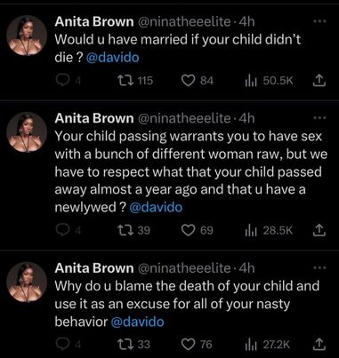 “Would u have married if your child didn’t die? @davido. Your child passing warrants you to have sex with a bunch of different women raw, but we have to respect what that your child passed away almost a year ago and that u have a newlywed. @davido. Why do u blame the death of your child and use it as an excuse for all of your nasty behavior”.