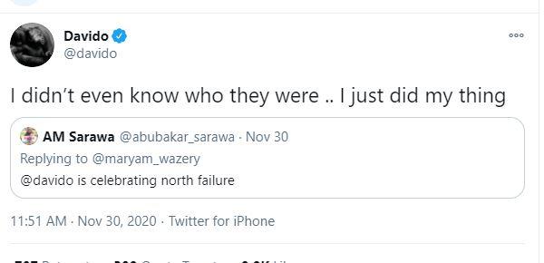 In response to the backlash, Davido quickly noted that his activities with the Kogi governor’s children had nothing to do with the situation of things in the north.