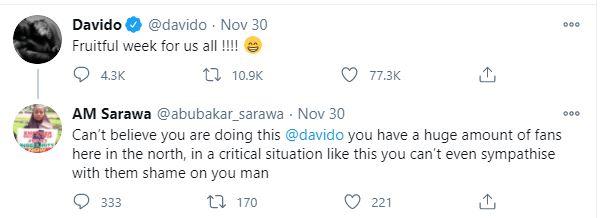 “Can’t believe you are doing this @davido you have a huge amount of fans here in the north, in a critical situation like this you can’t even sympathize with them shame on you man.”