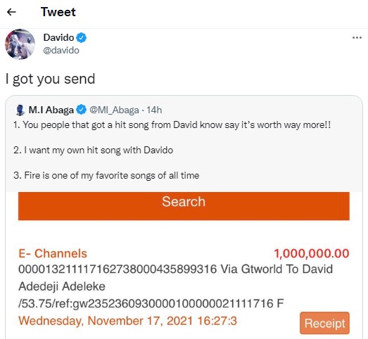 However, while reacting to MI Abaga’s request on the social micro-blogging platform, Davido responded favorably, writing;