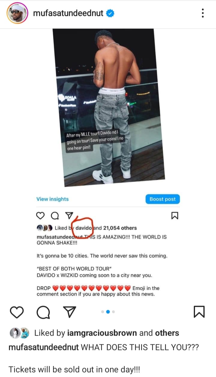 Davido spotted the announcement on Tunde Ednuts’ page on Instagram and clicked the ‘like’ button, which raised speculations that he has confirmed the tour.