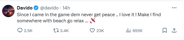 “Since I came in the game dem never get peace .. I love it ! Make I find somewhere with beach go relax … 🛩️”