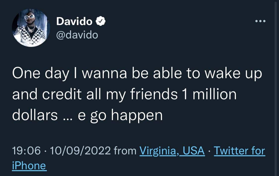 In a tweet via the micro-blogging platform, Twitter, he wrote, “One day I wanna be able to wake up and credit all my friends 1 million dollars … e go happen.”