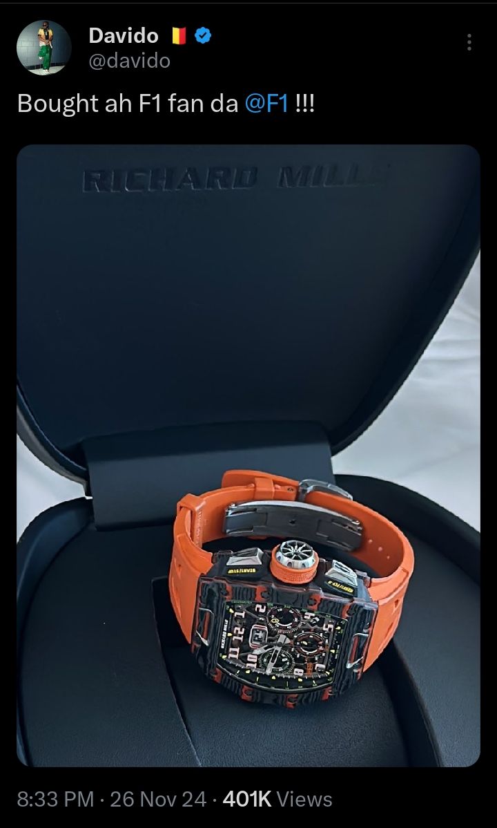 On X (formerly Twitter), Davido shared a photo of his newly acquired Richard Mille wristwatch, showcasing its exquisite features.