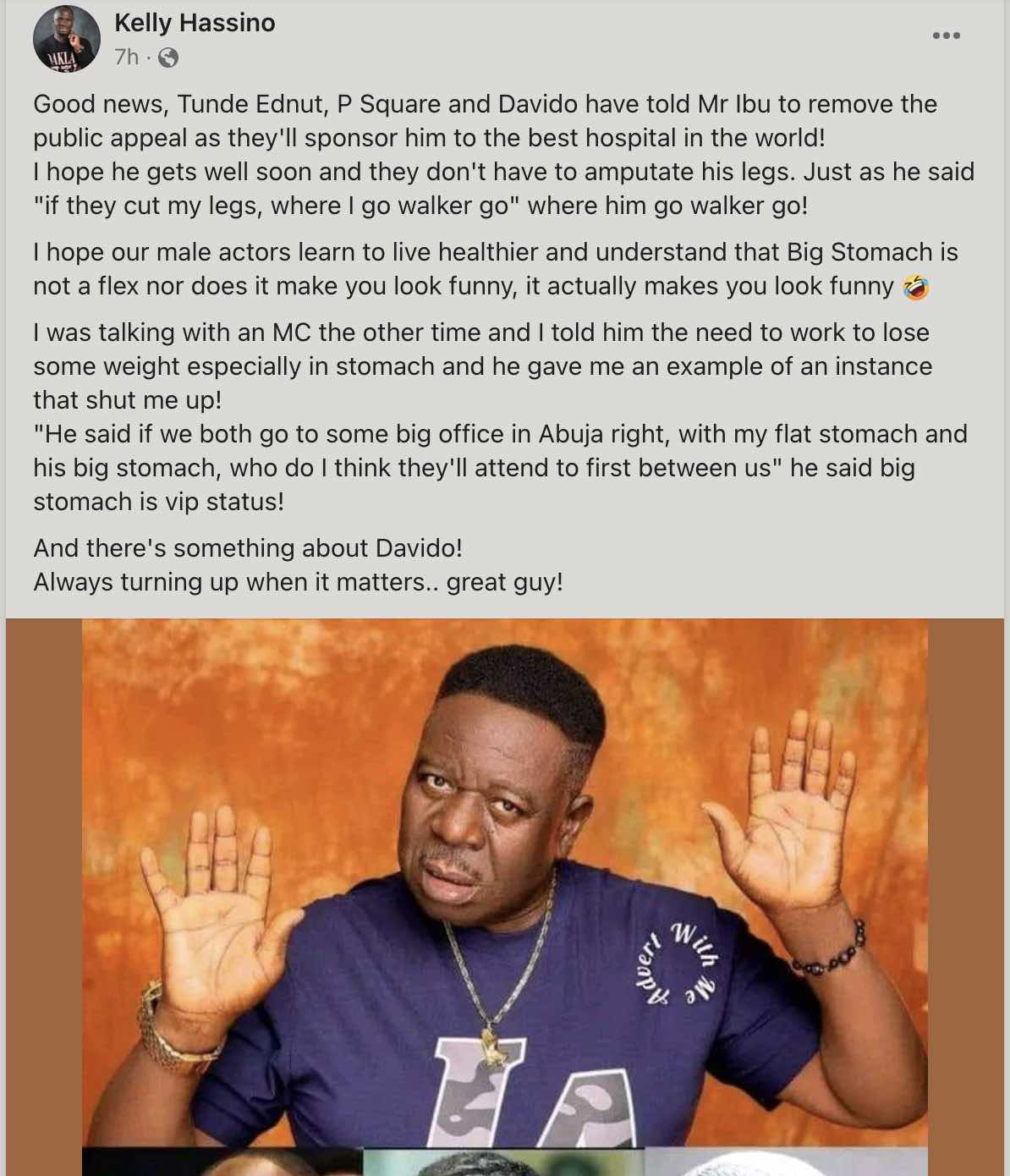 In his post he said; “Good news, Tunde Ednut, P Square and Davido have told Mr Ibu to remove the public appeal as they’ll sponsor him to the best hospital in the world!