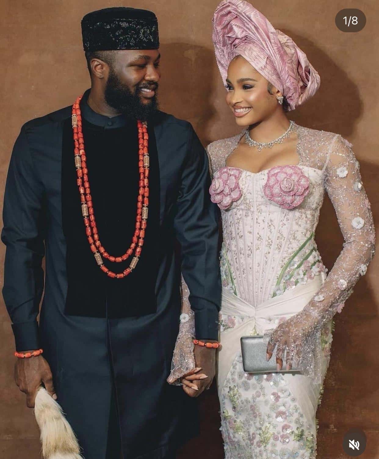 Fashion entrepreneur Andrea Iyamah tied the knot with the love of her life on May 11th, 2024 in a spectacular way. The beading of the fabric was its beauty, plus the crown of beads on her head made her look all the more regal. Her husband was also splendid in a white kaftan, and red wrapper.