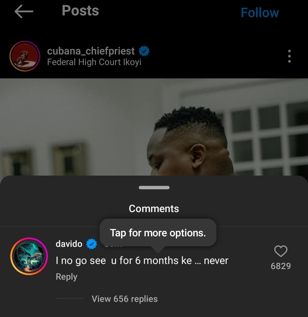 Amidst this, Davido rushed to the comment page of his celebrity best friend, Cubana Chief Priest. Using Bobrisky as a case, he declared that it is impossible for him not to see Cubana Chief Priest for six months.