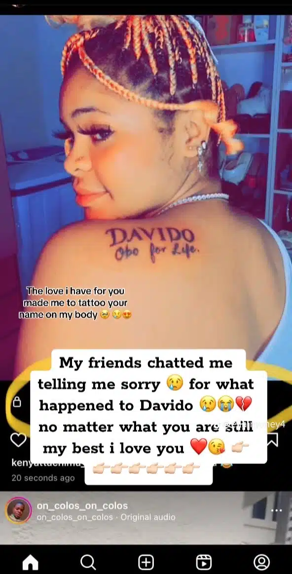 “Davido, you’re my best, I love you” – Beautiful lady declares love for Davido as she tattoos his name on her back