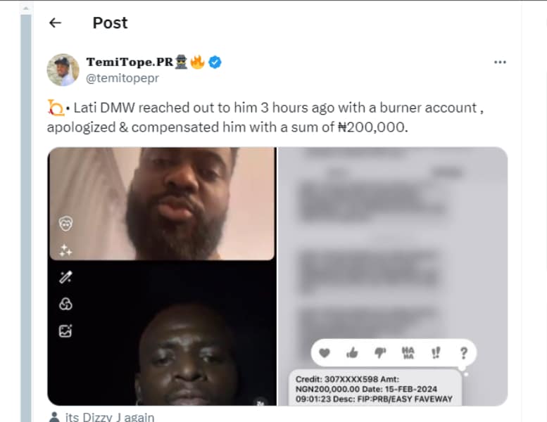 He captioned his post, “Lati DMW reached out to him 3 hours ago with a burner account, apologized & compensated him with a sum of ₦200,000.”