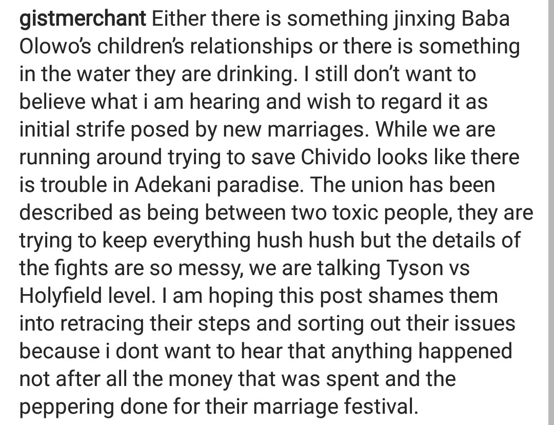 “Either there is something jinxing Baba Olowo’s children’s relationships or there is something in the water they are drinking. I still don’t want to believe what i am hearing and wish to regard it as initial strife posed by new marriages.